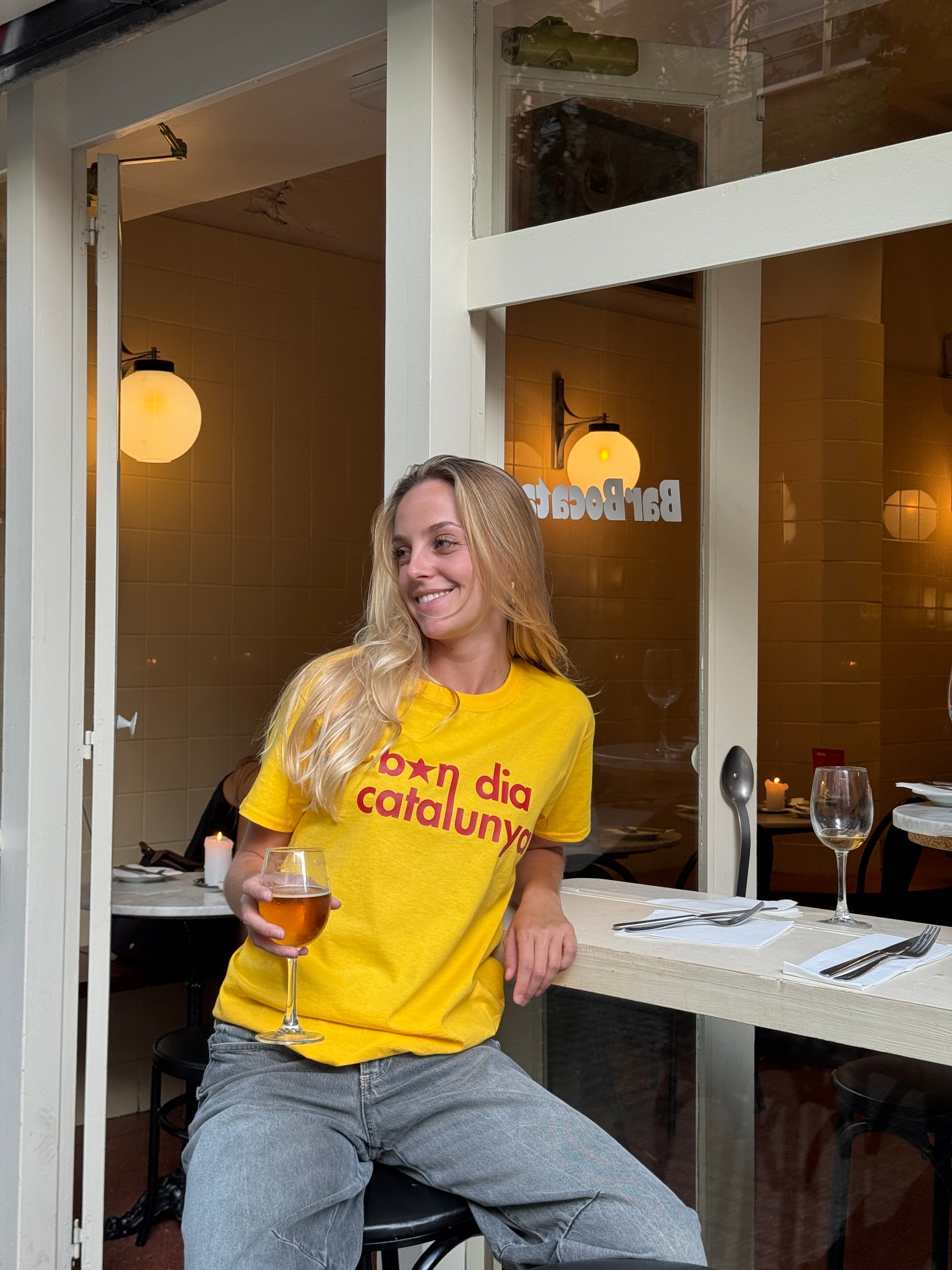 Edició especial de la samarreta "Bon Dia Cat" amb els colors de la senyera per celebrar el 11 de Setembre. Aquesta camiseta de cotó suau està dissenyada amb el lema “bon dia Catalunya” al davant i una estrella vermella amb el detall “cat” al darrere. Disponible en blanc o rosa clar, és perfecta per mostrar el teu amor per la terra amb un toc modern i reivindicatiu.